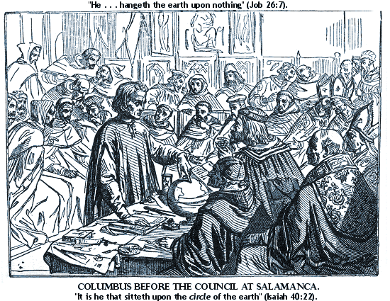 UR FRONTISPIECE REPRESENTS an interesting scene in the life of the discoverer of the New World. A plainly-attired, earnest-looking mariner, with that steady determination which characterises all true men whose convictions are strong and whose faith is steady, is meeting the objections of a number of learned professors of the sciences, dignitaries of the Romish Church, and learned friars, and defending the theory of the rotundity of the earth. An obscure navigator, strong in his belief, scouted by the illiterate, seeks in the Dominican convent in Salamanca, the great seat of learning in Spain, the sympathy and co-operation of the most erudite assembly his country can muster. Does he gain either sympathy or help? History answers, No. In the first place, anything new, however true, was stigmatized as heresy in those Inquisition times, and Columbus might well fear the consequences of indulging any thought that savoured of heresy. Priestcraft, that great curse of mankind, was sure to oppose a new theory which overturned the testimony and traditions of the Church. Then, too, the scholastic body had too much learned pride to yield to a simple navigator. "It was requisite," says Las Casas "before Columbus could make his solutions and reasonings understood, that he should remove from his auditors those erroneous principles on which their objections were founded;" which Columbus could not do, as the Ptolemaic plan had not yet been reversed, Copernicus not having at that time discovered the true theory of the solar system. Very small hope for Columbus to convert so stubborn an audience!