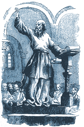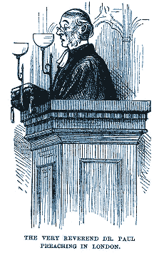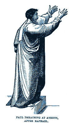 Ministers cannot be blamed for ungainly postures and attitudes when only a very small part of their bodies can be seen during a discourse. If it was the custom to preach as Paul did at Athens public speakers would become models of propriety, but when the usual method is modeled upon our woodcut of "The Reverend Dr. Paul preaching in London" we cannot marvel if the ungainly and the grotesque abound. By the way, it is interesting to note that Raphael in his representation of Paul at Athens evidently had in his mind the apostle's utterance, "God dwelleth not in temples made with hands, neither is worshipped with man's hands": hence he delineates him as lifting his hands. I am indebted for this hint to G. W. Hervey, M.A., who has written a very able and comprehensive "System of Rhetoric." [3]