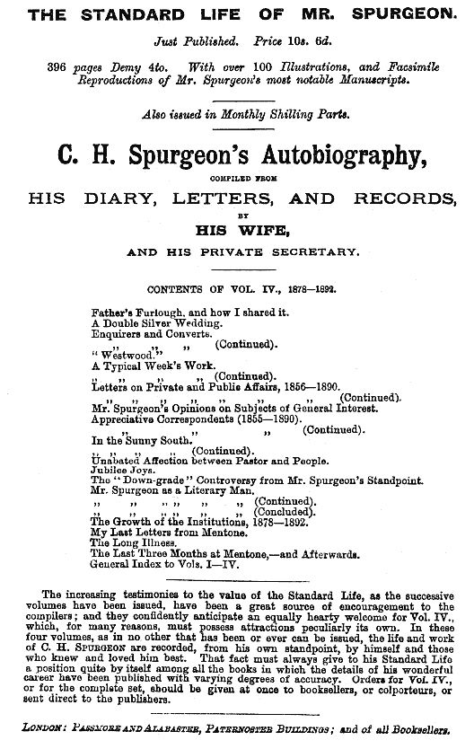*MR. SPURGEON was referring to the arrangements which had been made for a sacred concert and a gospel address combined at the Alhambra Palace. Happily, the minister who took the service, abandoned it after one attempt, being convinced that more harm than good would result from it; but, unhappily, since then, not only have sacred concerts been regularly established, either with or without gospel addresses; but many places are open, on the Lord's-day, for secular concerts, at which there is not even the pretence of any religious service. Our comfort still is, as it was MR. SPURGEON'S over forty years ago, that "the Lord reigneth," and he will get the victory over all his adversaries.